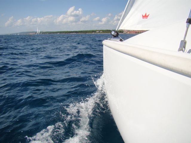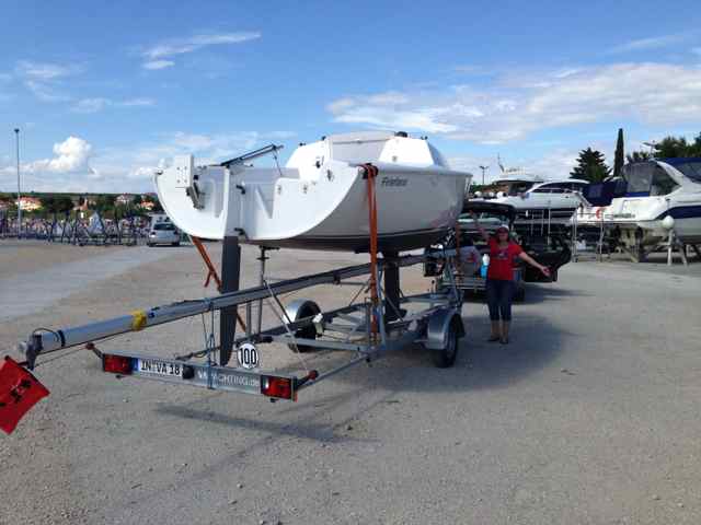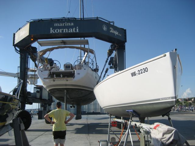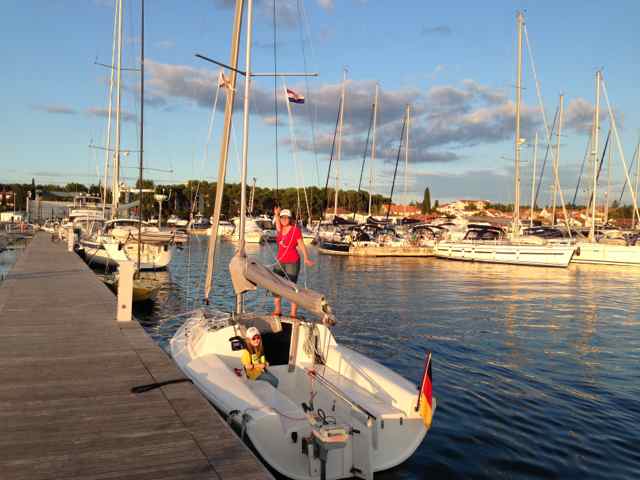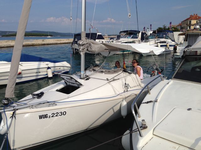 Eigentlich haben wir für einen Tag genug erlebt. Aber leider will da noch ein Boot ins Wasser. Hilft ja nix, ran an den Speck! Wir lernen erst einmal, die gewohnte durchorganisierte deutsche Denke mit festen Kranterminen, Trailerstellplätzen und Wartezonen durch südländische Gelassenheit zu ersetzen. Also suchen wir uns ein ruhiges Plätzchen, wo wir nicht allzu sehr im Weg stehen und bereiten in Ruhe die Kranaktion vor. Spanngurte und Befestigungen abbauen, Böcke aufstellen, Mast abladen und auf Böcken lagern, Mast von Verzurrungen befreien, alle Teile am Mast montieren und schließlich anstellen zum Einkranen. Kurze Zeit später küsst der Kiel zum ersten mal Salzwasser nur der Mast liegt leider immer noch an Land. Mangels geeigneter Liegeplätze zum Maststellen verbleiben wir kurzerhand unter dem Kran (-> südländische Gelassenheit) und schleppen den Mast an Bord. Ewiges Gefummel mit dem Mastbolzen und schließlich unsere "Lieblingsarbeit": Mast stellen. Inzwischen haben meine Frau und ich etwas Sicherheit darin gewonnen. Aber trotzdem schießt mir immer noch jede Menge Adrenalin durch die Adern und der Puls geht auf 180. Die beste Ehefrau von allen zieht am Vorstag während ich den Mast immer höher stemme und dabei möglichst in der Längsachse halte (bei etwas Schwell im Hafen gar nicht so einfach). 4 Sekunden, die sich immer vieeeel länger anfühlen, und der Mast steht. Jetzt noch solange nach vorne drücken, bis Frau den Vorstagbolzen eingefummelt hat: Geschafft. Ein wohliges Gefühl breitet sich im Körper aus. Mit einer gewissen Genugtuung nehmen wir zur Kenntnis, dass unsere "Vorkraner" immer noch mit Ihrer Jüt beschäftigt sind...
