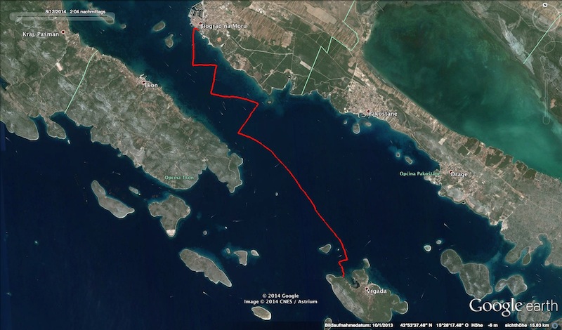 Die Sonne versinkt hinter der Insel Pasman während wir einen Liegeplatz ganz vorne am Steg ergattern. Schnell mit dem Auto zum Steg und kurze Zeit später stapeln sich Taschen, Rucksäcke und Beutel am Steg. Soviel Gepäck? Muss das wirklich alles mit? Angesichts schönstem Wetter und schweisstreibender Temperaturen bleiben die Ölzeughosen im Auto. Wer braucht die schon?