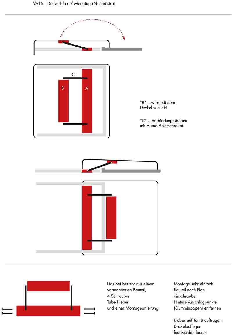 wirklich eine gute Idee. Anstelle von A und B könnte man auch Montageplatten für Gasdruckfedern verwenden. Für C könnten eventuell Gasdruckfedern ebenfalls eine Lösung sein.