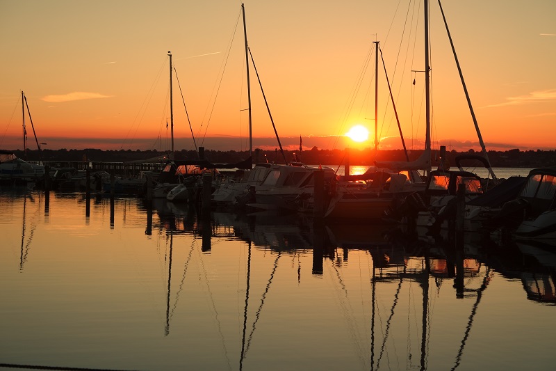 Diesmal mit frischer Brise aus Ost. Wir haben konstant 4, in Böen 5 Bft gemessen. Endlich Wind um die Kleine mal richtig auszufahren! Und wie sie das gemacht hat: Trotz des geringen Tiefganges von nur 80 cm, aber mit für die Größe des Bootes ordentlich Tuch am Wind knackten wir kontinuierlich die 6-kn-Marke! Rudergänger und Vorschoter auf der hohen Kante - "nur aufrecht segelnde Boote sind schnell segelnde Boote" - brachten das notwendige Gewicht nach Luv. Natürlich gingen bei diesem Speed auch die Wenden spielend von der Hand und so konnten wir Langballigau schon bald nicht mehr achteraus erkennen. Am Ausgang der Förde legten wir Kurs Sønderborg an, denn es sollte nochmal zum Stadthafen zum Souvenier-Shoppen gehen. Die wunderschöne und fußläufig leicht erreichbare Fußgängerzone von Sønderborg empfing uns dann auch mit der dänischen Gelassenheit, die wir so sehr lieben bei Land und Leuten. Ein Kaffee in der Sonne (zuhause im Süden Deutschlands musste bereits geheizt werden), ein kleiner Spaziergang zur Christian IX Brücke und zurück zum Boot waren das Abschlussprogramm, bevor wir uns in die Marina von Sønderborg verholten. Auch hier konnten wir einen wunderschönen Sonnenuntergang erleben und das letzte auf dem Campingkocher zubereitete warme Essen genießen.