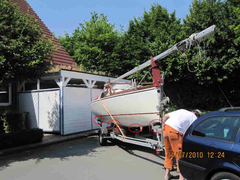 - Das Boot wurde vom Hafenmeister in Assens PERFEKT auf dem Trailer abgestellt (Danke Alex für Deine Geduld). Mittig, nicht nach rechts oder links verschoben, wunderbar an der angezeichneten Linie vor dem Kiel um das Hauptgewicht direkt auf der Achse zu haben.