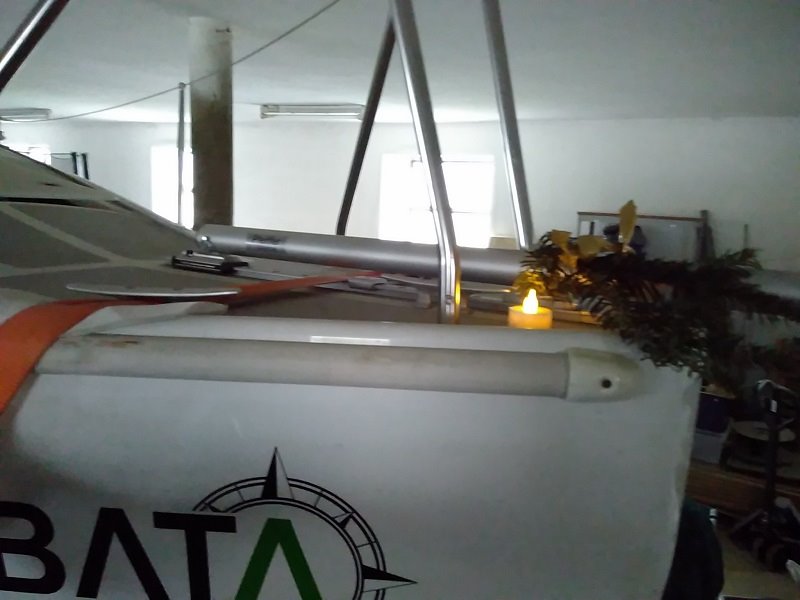 Dann Sprayhood einfädeln und Stangen rein, Baum hin, Lazyjacks und Flaggenleinen festgetüddelt, Boomstrut drunter, Racing-Fock rein - fertig. Nee, der Adenauer fehlt noch, aber das ist ja ein Klacks.